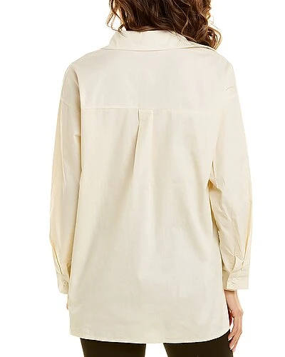 - Design details: dropped-shoulder sleeves, left chest pocket, button cuffs, box pleat at back, and high-low hem