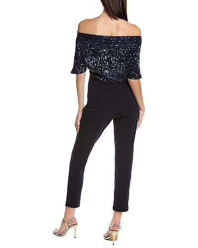 - Athena One-Shoulder Jumpsuit in navy with draped sleeves