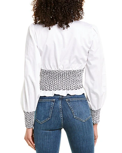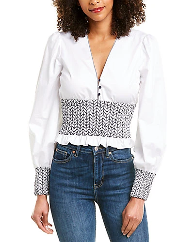 - Design details: mandarin collar and V-neck, contrast trim, smocked waist, and bishop sleeves with smocked cuffs