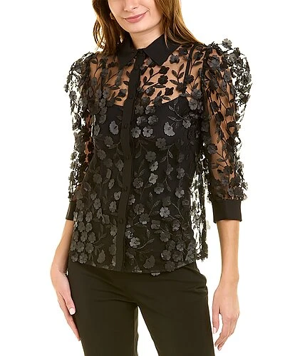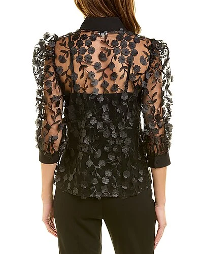 - Sheer Mesh Blouse in black floral with Floral applique, 3/4-length puff sleeve with button, rounded hem line