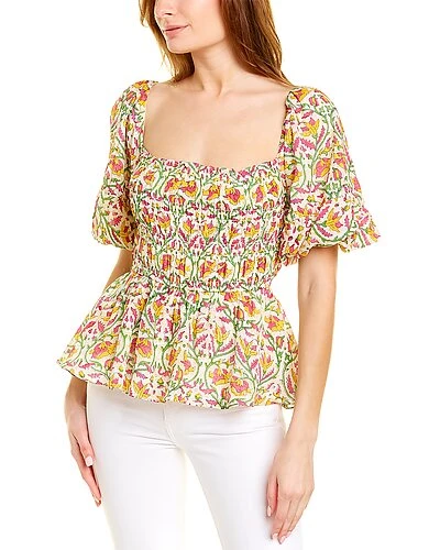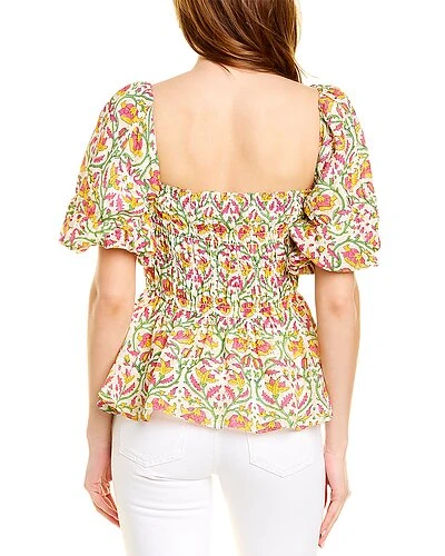 - Design details: square neck, puff sleeves, smocked accents, and peplum waist