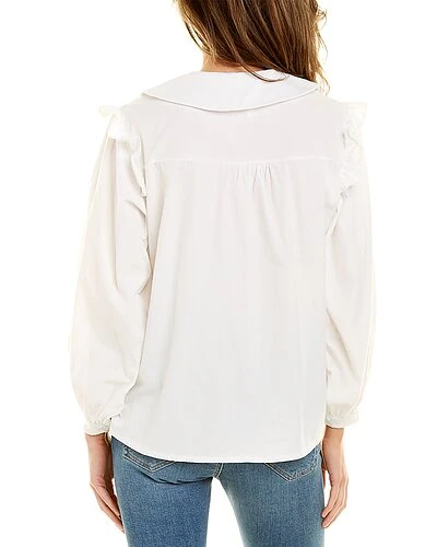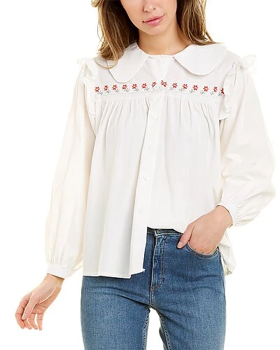- Design details: rounded collar, ruffle detail, embroidered accents, blouson sleeves, and button cuffs