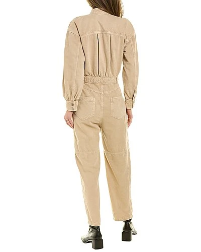 - 3/4-Sleeve Linen-Blend Jumpsuit in beige with mock collar, left chest pocket, dual front pockets, button cuffs, dual back pockets, and belt loops