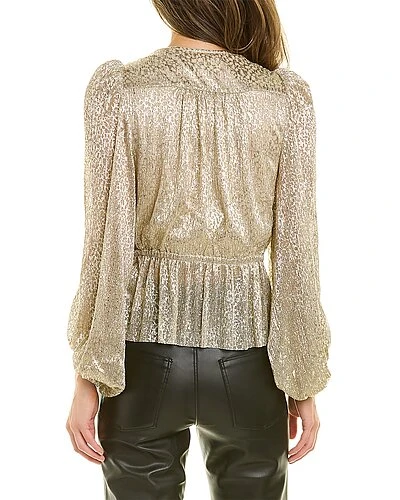 - Blouse in gold with metallic printed design, surplice bust, blouson sleeves, elasticized cuffs, and elasticized peplum waist