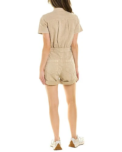 - Daquiri Linen-Blend Romper in beige with mock neck, left chest pocket, dual front pockets, pleated leg, dual back pockets, belt loops, and rolled cuffs