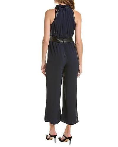 - Halter Jumpsuit in navy and black with belted waist, faux leather trims, and ruffle accent at neckline