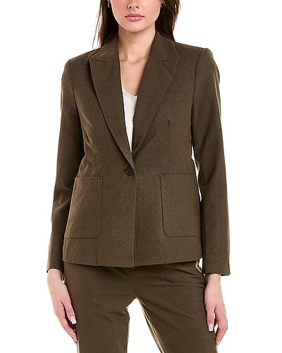 - Jacket in olive with peak lapel, left chest pocket, two front pockets, button cuffs, and center vent at back hem