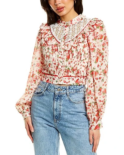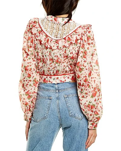 - Pleated Lace Top in red with sheer lace yoke, scalloped trim, pintuck detailing and button cuffs