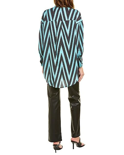 - Zigzag Top in blue with self-tie neck sash, dropped-shoulder sleeves, button cuffs and shirttail hem