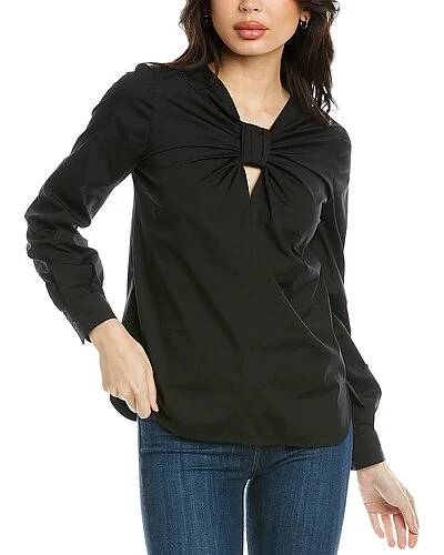 - Wide Sleeve Knot Shirt in black with V-neck with knot detail, button cuffs, and rounded hem