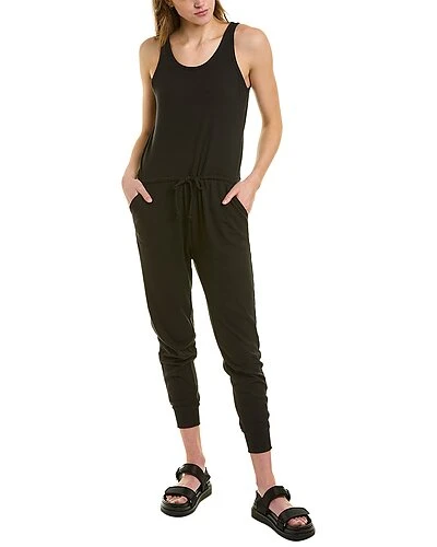 - Cozy Rib Jumpsuit in true black with scoop neck, elasticized drawstring waistband , and dual front angled pockets