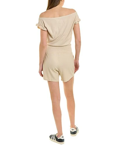- Cozy Rib Smocked Romper in bark with boatneck, ruffle sleeves, smocked waist, and dual front angled pockets