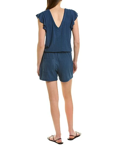 - Poor Boy Rib Romper in blazer with ribbed design, V-neck, flutter shoulders, elasticized drawstring waistband, and dual front angled pockets