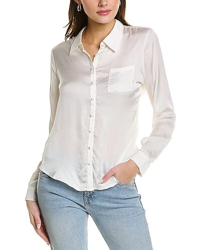 - Silky High-Low Blouse in jasmine with left chest pocket, button cuffs, inverted back pleat, and high-low hem