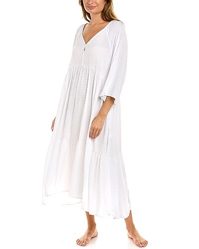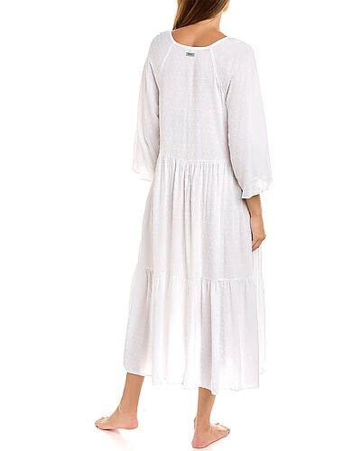 - Design details: Swiss dot fabric, V-neck, 3/4-length sleeves, shirred skirt, and side slits at seams