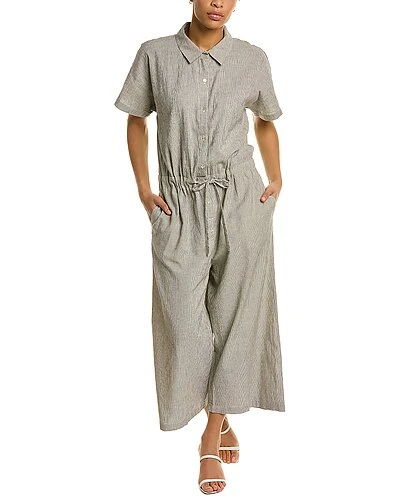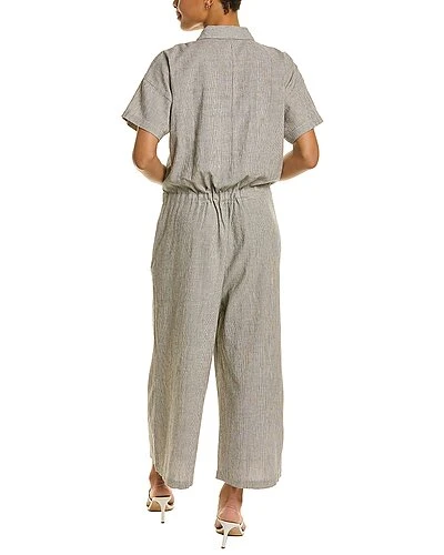 - Mini Stripe Classic Linen-Blend Jumpsuit in black stripe with spread collar, drawstring waist and dual side seam pockets