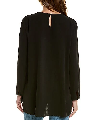 - Round Neck Long Silk Top in black with high-low hem and slits