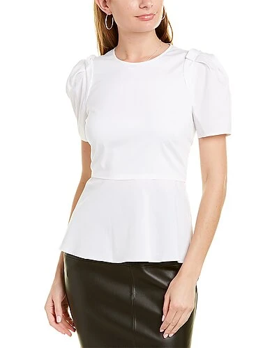 - Cressida Shirt in white with pleated puff sleeves and peplum hem