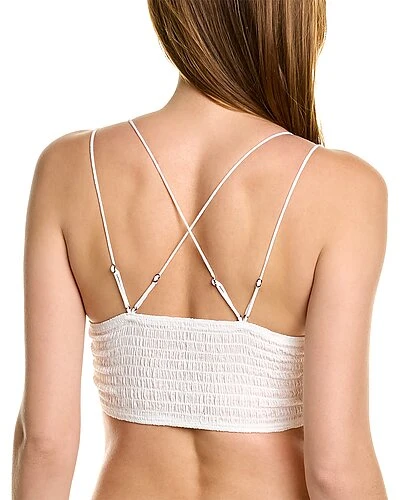 - Adella Bralette in white with lace design, adjustable shoulder straps and smocked back
