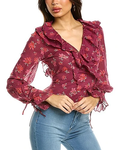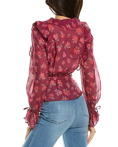 - Amanda Ruffle Top in pink with surplice neckline, ruffle trim, elasticized waist and bell-sleeves with self-tie detail
