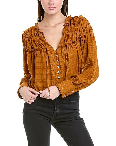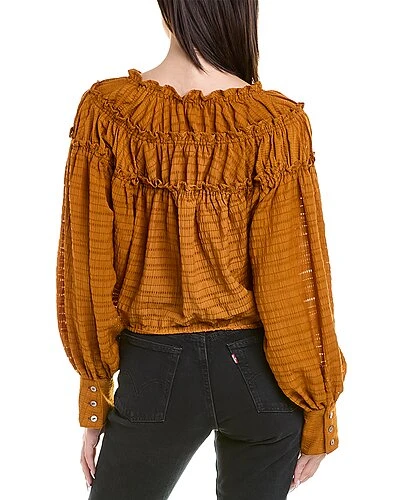 - Hailey Blouse in terracotta with textured design, elasticized neckline, balloon sleeves, button cuffs, and elasticized hem