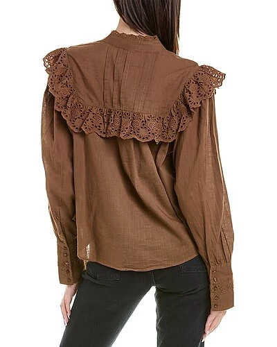- Hit The Road Top in coffee date with band collar, eyelet ruffle trim, pintuck details, and button cuffs