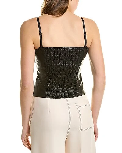 - Corset Top in black with faux leather design, stud detailing, smocked back panel, and adjustable shoulder straps