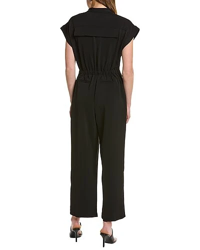 - Criss-Crossed Waist Jumpsuit in black with dual chest pockets, pleated front, round neck, and cap sleeves