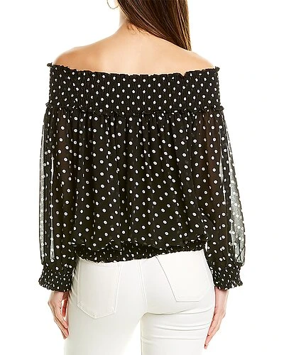 - Dot Pattern Off-Shoulder Top in black with semi-sheer design and smocked neckline and hem