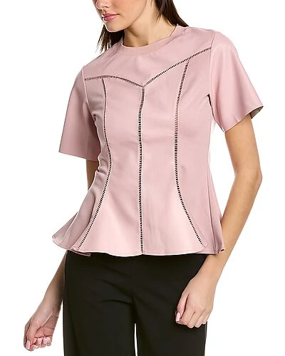 - Ladder Stitch Top in pink with faux leather panels, ribbed neckline, and peplum hem