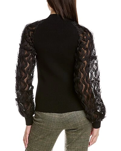 - Mesh Sleeve Top in black with rib design and ruffle mesh sleeves