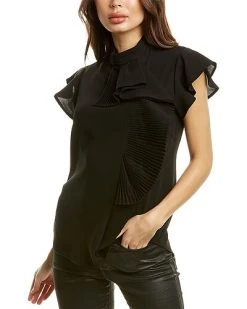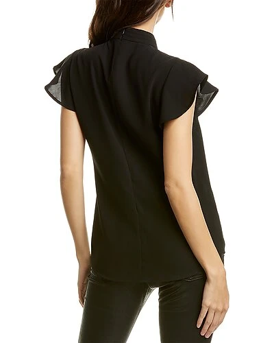 - Pleated Ruffle Top in black with pleated mock neck and pleated ruffle detail