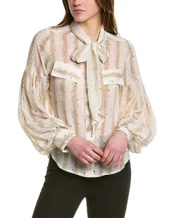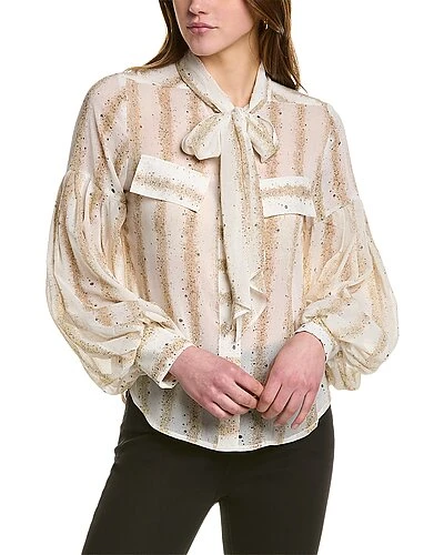 - Puff Sleeve Blouse in white with decorative faux pockets at chest, tie at neck, dropped shoulder sleeves, and button cuffs