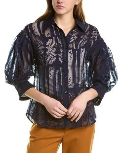 - See-Through Flower Top in navy with 3/4-length sleeves and mesh yoke