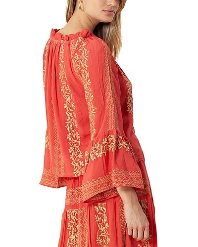 - Off-The-Shoulder Top in berry with embroidered design and off-the-shoulder bell-sleeves
