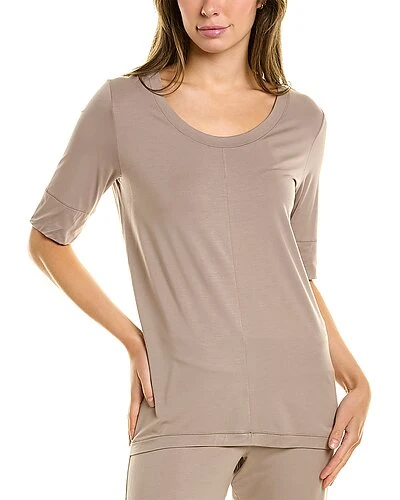 - Yoga Top in taupe grey with center seams and slight high-low hem