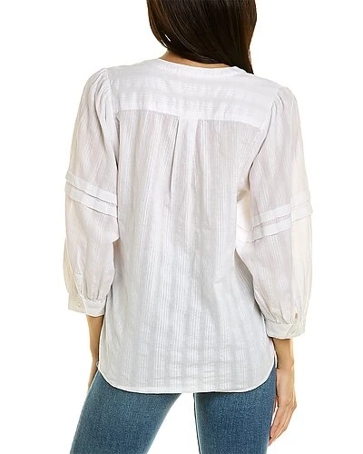 - Laramie Blouse in white with 3/4-length balloon sleeves, button cuffs, box pleat at back, and shirttail hem