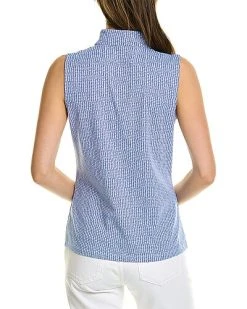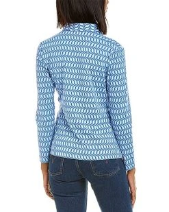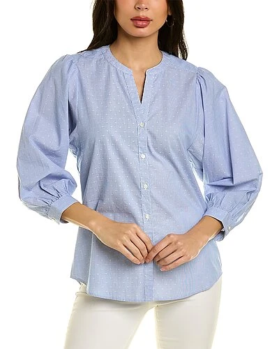 - Megyn Swiss Dot Blouse in blue and white with 3/4-length sleeves and shirttail hem