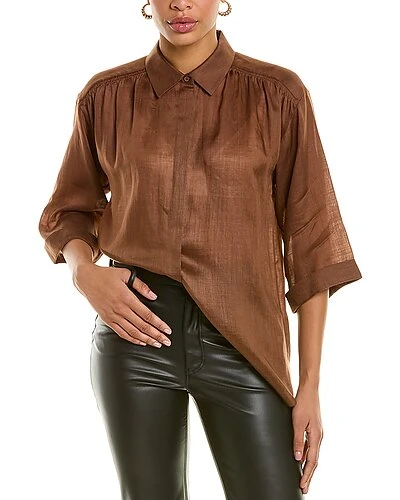 - Nila Blouse in copper dust with spread collar, shirred shoulders, and 3/4-length sleeves