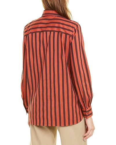 - Ruxton Blouse in chili red multicolor with mixed stripe design, spread collar, left chest pocket, and button cuffs