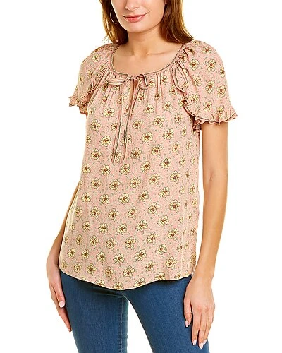 - Tulip Sleeve Top in blush vine poppy with ruffled trim, pleated front, and tulip cuffs