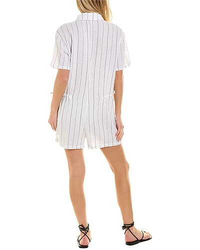 - Pinstripe Gauze Romper in white with spread collar, left chest pocket, and drawstring waist