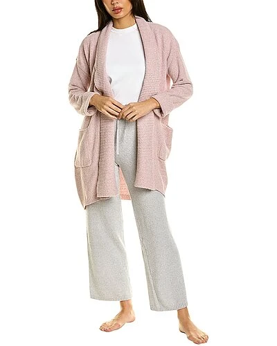 - Aura Ribbed Cardigan in heather nude blush with soft plush design, ribbed shawl collar, two front pockets, and tie-sash at waist