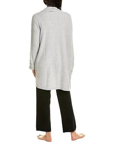 - Aura Ribbed Cardigan in heather dove grey with soft plush design, ribbed shawl collar, two front pockets, and tie-sash at waist
