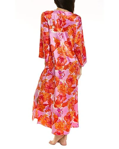 - Hibiscus Zip Caftan in fuchsia combo with satin design, side seam pockets, and side slits at hem