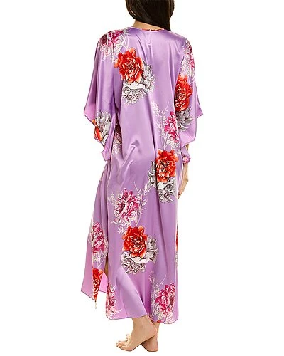 - Peony Blossom Caftan in purple combo with satin design, kimono sleeves, side seam pockets, and slits at hem
