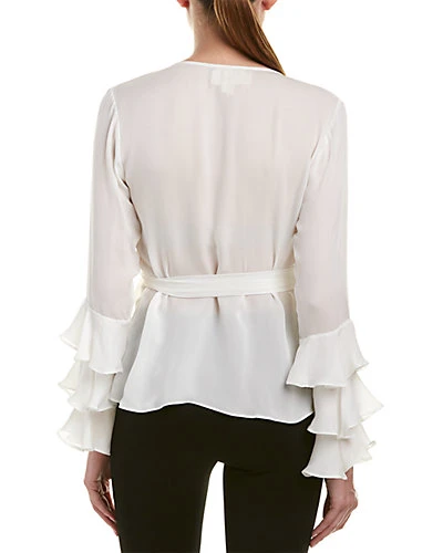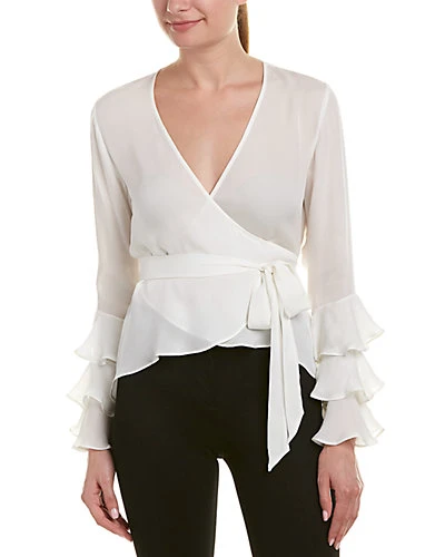 - Design details: wrap design, tiered ruffle sleeves