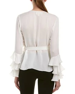 - Design details: spread collar, ruffled peplum waist, shirred bishop sleeves with self-tie cuffs