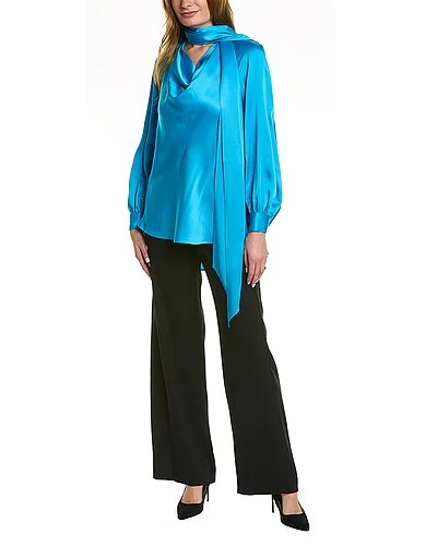 - Cowl Neck Blouse in lagoon with neck tie detail, high-low style hem, oversized silhouette, and button cuffs
