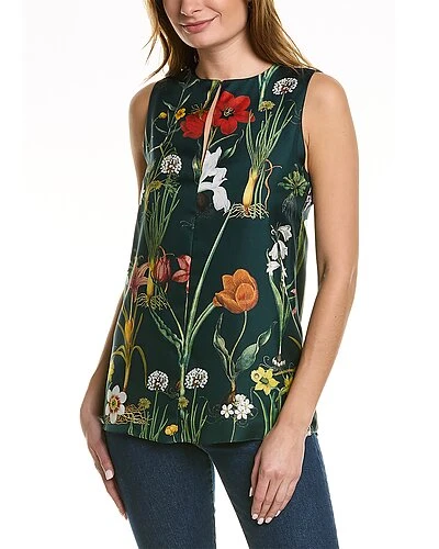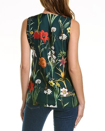 - Silk Blouse in blue multicolor floral with sleeveless design, rounded hem, and V-Neck